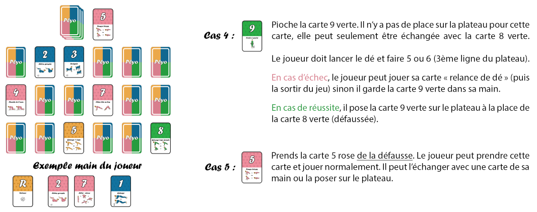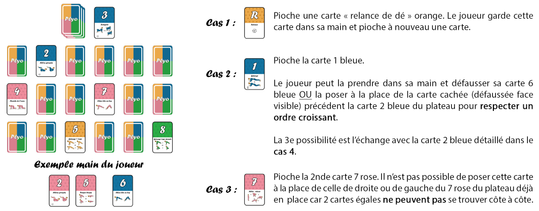 - Echanger la carte avec une carte cachée du plateau : la carte posée doit se trouver sur la bonne ligne de couleur et respecter un ordre croissant (du plus petit au plus grand).
