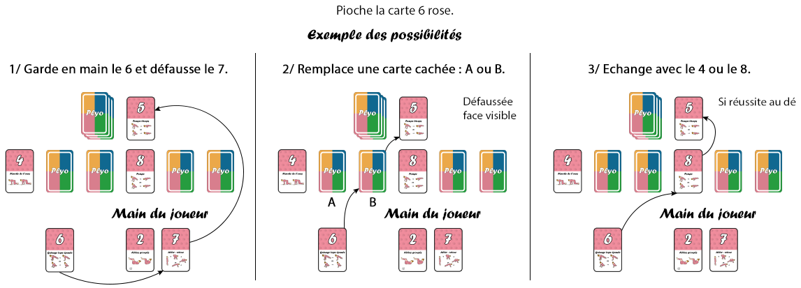 - Echanger une carte de sa main : si le joueur possède déjà une ou plusieurs cartes de la même couleur alors il peut défausser une d’entre elles pour la remplacer par la carte piochée.
