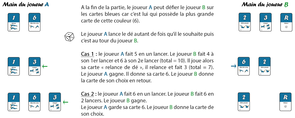 Le but du duel est de lancer le dé pour s’approcher du nombre de la carte dont le joueur (A) souhaite se débarrasser sans le dépasser, sinon c’est la défaite immédiate.