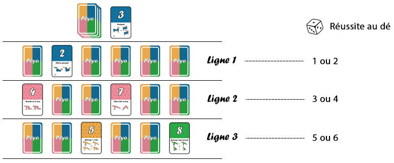 En cas de réussite : le joueur défausse la carte remplacée et pose sa carte à son emplacement. La carte posée doit se trouver sur la bonne ligne de couleur et respecter un ordre croissant (du plus petit au plus grand).