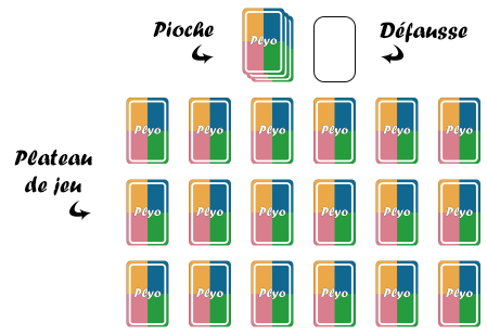 * Les cartes des joueurs sont posées face visible devant eux. Les cartes de la défausse sont posées face visible les unes sur les autres. * Au départ, les trois lignes du plateau n’ont pas de couleur définie. C’est en posant les premières cartes qu’on obtient une ligne de chaque. * Deux cartes ayant le même numéro ne peuvent pas se trouver sur la même ligne.